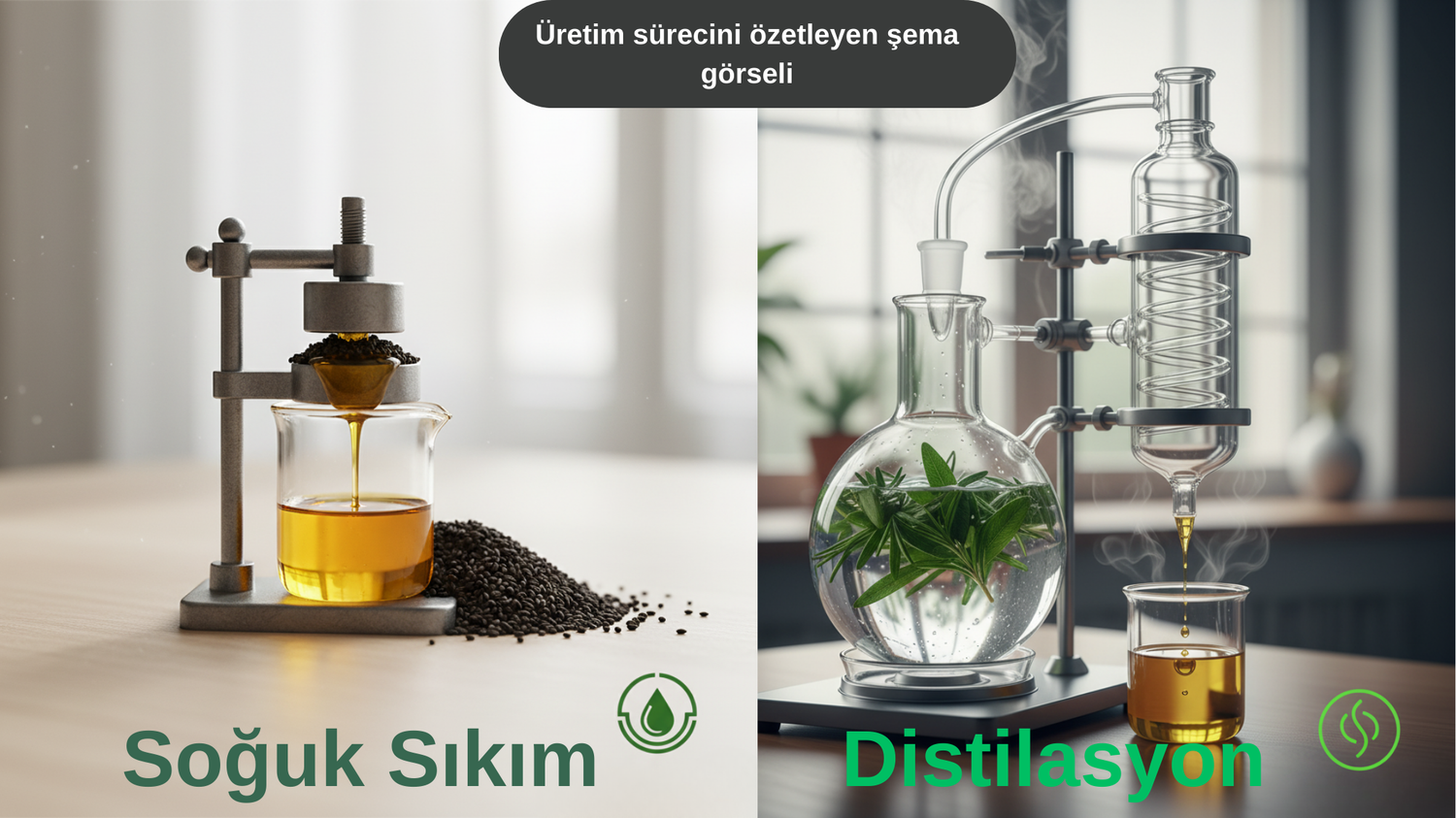 Üstün Üretim Metotları: Kaliteden ödün vermeyiz. Tohum yağlarımızda besin değerini koruyan Soğuk Sıkım; aromatik bitki yağlarımızda ise en saf ve konsantre özü elde eden Distilasyon yöntemini kullanırız.